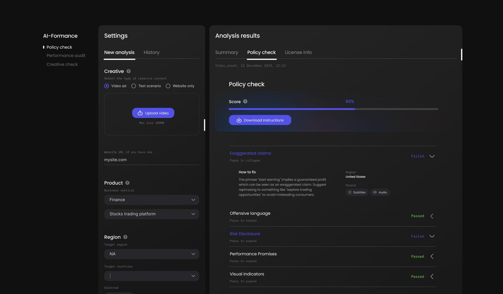 A detailed analysis of your creative’s alignment with TikTok policies for your selected vertical, subcategory, and each targeted country. Includes a downloadable guide on necessary changes for approval